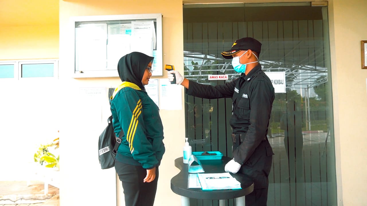 Petugas Sentul 8 Hotel mengecek suhu tubuh karyawannya.