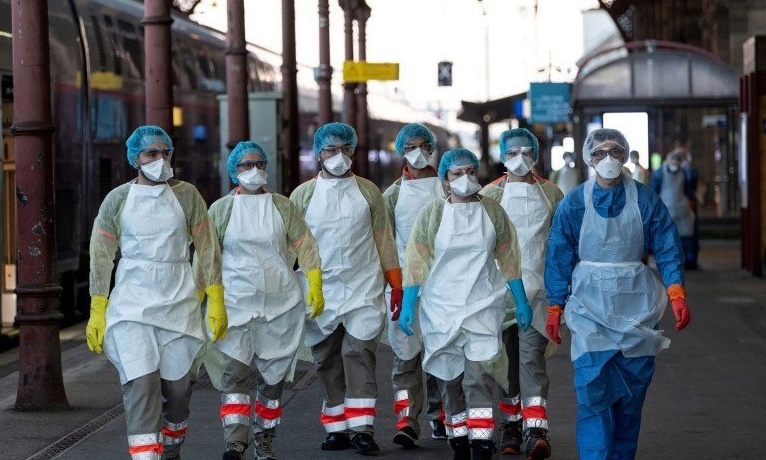 Petugas medis menunggu pasien virus corona (COVID-19), untuk naik kereta TGV medis kecepatan tinggi di stasiun Strasbourg, Prancis, Jumat (3/4/2020). Foto: ANTARA /Patrick Hertzog/Pool via REUTERS/AWW/djo