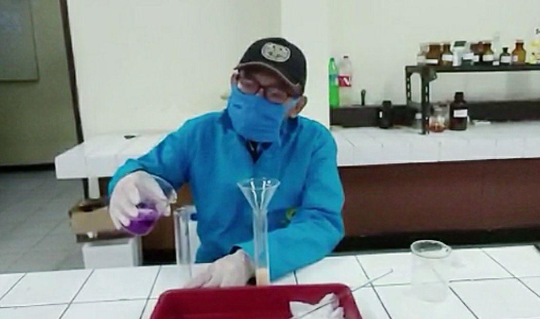 Rektor Universitas Djuanda, Dede Kardaya saat pembuatan cairan disinfektan. (Humas Unida)