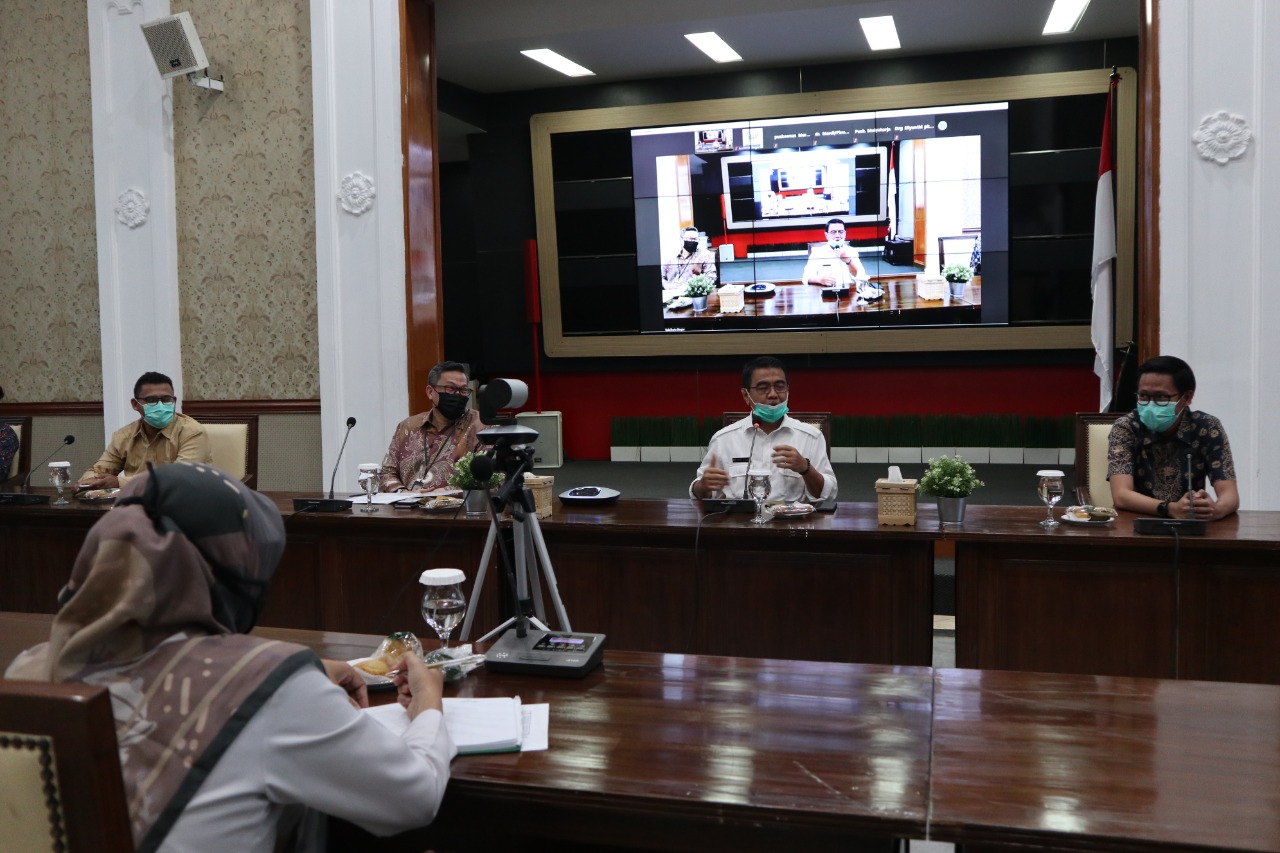 Wali Kota Bogor, Bima Arya didampingi Sekda Kota Bogor Ade Sarip Hidayat, Kepala Inspektorat Pupung W. Purnama dan Kepala Dinkes Sri Nowo Retno mengikuti Video Conference di Paseban Punta, Balai Kota Bogor.
