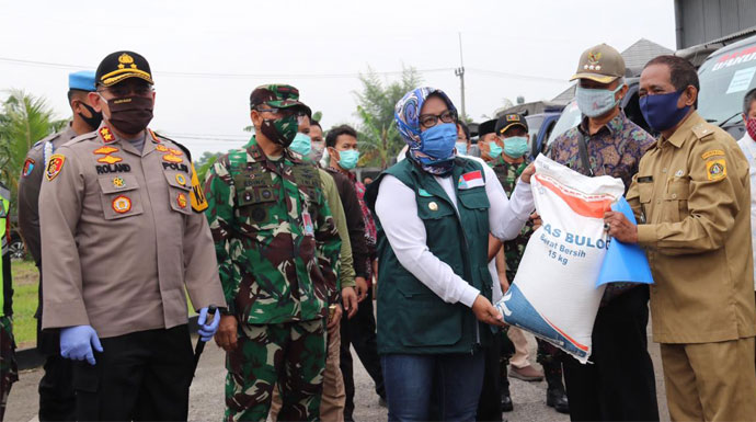 Bupati Bogor saat memberikan beras bantuan sosial terdampak Covid-19, beberapa waktu lalu di gudang Bulog, Dramaga.    (Foto : Hendi / Radar bogor)