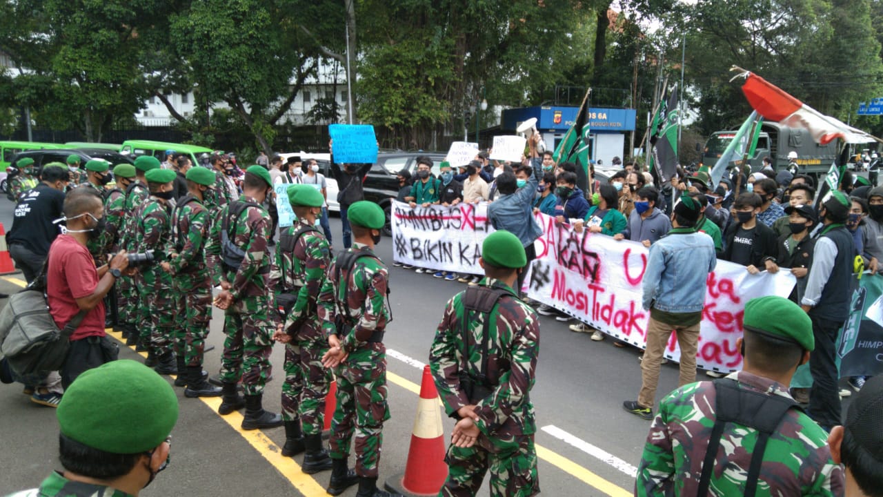 Namun, kali ini beda. Aksi unjuk rasa jauh lebih damai. Ketika TNI berada di barisan depan menjaga para pendemo. Seperti yang terjadi di depan Istana Bogor, Rabu (7/10/2020) siang.