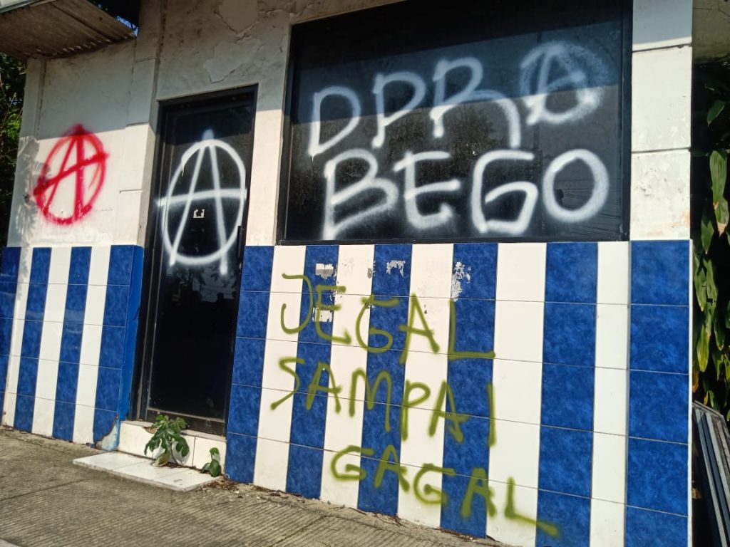 Vandalisme tersebut bertuliskan “DPRD BEGO” dengan warna pilox putih. Tulisan tersebut tertulis di kaca. Juga di sebelah kanan tulisan tersebut nampak lambang kelompok Anarko.