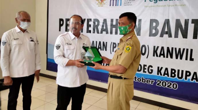 CIGUDEG-RADAR BOGOR, PT Pegadaian (Persero) Kanwil VIII Jakarta 1 turut kembali melaksanakan CSR memberikan sumbangan bina longkungan dan dana kepedulian sosial yang berlangsung di Aula Kecamatan Cigudeg, Selasa (20/10/2020).