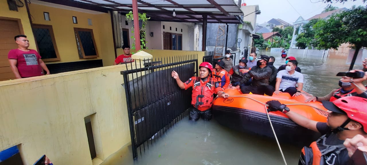 Menggunakan perahu karet, Wali Kota Bogor Bima Arya didampingi petugas mengecek lokasi banjir sekaligus mendatangi satu persatu rumah yang masih didiami warga.