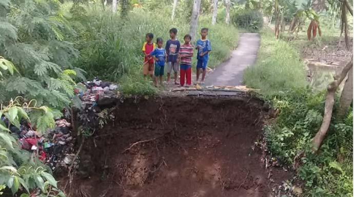CIAMPEA-RADAR BOGOR, Akses jembatan penghubung Desa Bojongjengkol dan Desa Cihideung Udik, Kecamatan Ciampea, amblas akibat tebing tumpuan pondasi longsor, Senin (26/10/2020) pagi.