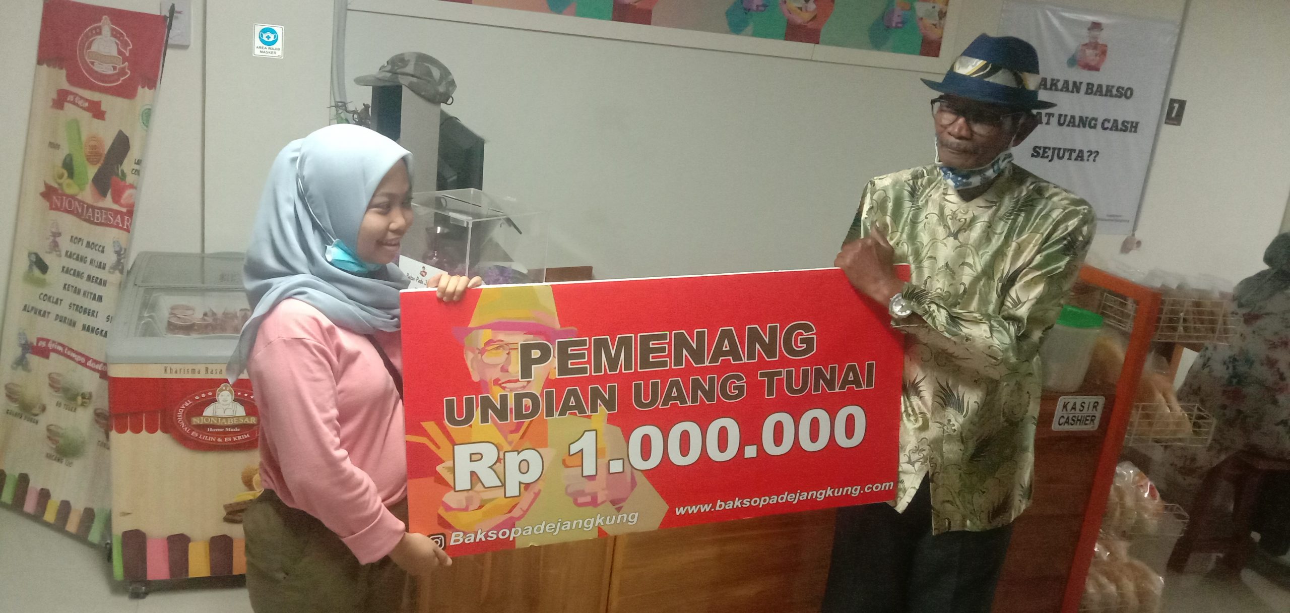Dia terpilih sebagai pemenang ‘Makan Bakso Dapat Satu Juta’ dari kedai kedai Bakso Pa’de Jangkung. Dan berhak menerima hadiah langsung berupa uang tunai di gerai cabang Pakansari Jalan Kolonel Eddie Yoso Martadipura No. 6, Cibinong, Kabupaten Bogor, Sabtu (14/11/2020) sore ini.