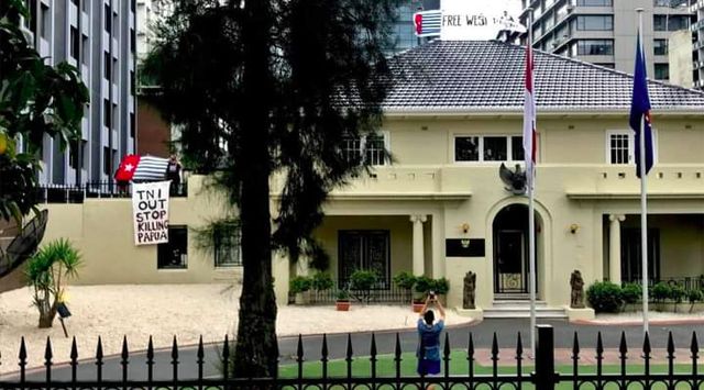 Dalam video yang diunggah akun YouTube Izzy Brown terlihat beberapa orang menaiki atap konsulat untuk membentangkan bendera OPM Bintang Kejora dengan tulisan ‘Free West Papua’. Tidak jauh dari sana, beberapa orang lainnya memasang banner yang bertuliskan ‘TNI Out Stop Killing Papua’.(rmol/pojoksatu)