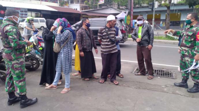 Danramil Cisarua-Megamendung, Manyor Inf Aris Nazarudin bersama jajarannya langsung memberikan teguran kepada masyarakat yang dinilai lalai menerapkan Prokes saat beraktivitas di luar rumah.